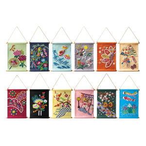 ★たおやかな糸の彩りに季節が宿る友禅柄 描かれた文様に思いを馳せながら、色鮮やかな綿糸をていねいに刺せば、味わい深く時節を愉しむ和飾りの完成です ●図案はプリント済み ●毎月飾り棒とひも付き 【コレクション内容】 4月:雨季と紫陽花、5月:七夕祭り、6月:貝合わせと波、7月:十五夜お月様、8月:菊祭り、9月:七五三参り、10月:雪輪文様、11月:正月のお飾り、12月:梅と鶯、1月:桃の節句、2月:満開の桜、3月:端午の節句 ●セット内容/図案プリント布、接着芯、刺しゅう糸、棒、ひも、作り方説明書など ●素材/図案プリント布・刺しゅう糸:綿など ●サイズ/約縦25×横16cm(棒・ひも含まず) ●用意する物/はさみ、ものさし、チャコペン(消せるタイプ)、アイロン、縫い針、縫い糸、あれば便利:刺しゅう枠など 東京手描き友禅/友禅に携わって六十余年の伝統工芸士「鎌滝 隆」がここだけで特別に描いた友禅図案に刺しゅうを施します デザイン/鎌滝 隆(かまたき たかし) 経済産業省認定工芸品「東京手描友禅」の伝統工芸士など多数の資格で認定され、受賞歴も多数。絵付け制作をはじめ、体験教室で講師も担う