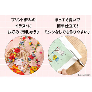 ★水森亜土のカワイイにキュン♪ メイクを楽しむような気分で、刺しゅうやビーズでイラストをおしゃれに飾り付け♪小物はまっすぐ縫うだけの簡単仕立てで、ミシンがなくても気軽に作れます♪ ●図案はプリント済み 【コレクション内容】 4月:お洗濯日和、5月:ドキドキの魔法、6月:おめかしレディ、7月:夢見る窓辺、8月:仲良しのお花畑、9月:花舞うブランコ ●セット内容/図案プリント布、無地布、刺しゅう糸、パーツ類、作り方説明書など ●素材/図案プリント布・無地布・刺しゅう糸:綿など ●サイズ/お洗濯日和:約縦7.5×横20cmなど ●用意する物/縫い針、まち針、縫い糸、チャコペン(消せるタイプ)、目打ち、あれば便利:ミシンなど 水森亜土/両手で絵を描きながら歌うパフォーマンスで注目され、世代を超えて日本の「カワイイ」感性を牽引。イラストレーター・歌手・女優として多彩な才能を発揮する稀有なアーティストです