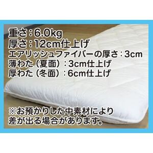 新登場 ! 今なら体験価格(3/30~5/17) 5/18以降の価格:38,500円 体験価格:37,400円 1,100円おトク ! エアリッシュファイバーによる3層構造 体圧分散で、新感覚の目覚めを ! <ポイント> 体圧分散で身体にかかる負荷を軽減 寝返りが楽な高反発 蒸れにくく快適 <エアリッシュファイバー> 三次元立体網状構造により優れた通気性と高反発性を持ち、湿気や熱を逃して快適な寝心地を支え、医療や介護分野でも活用される素材です。 薄わた(夏面)厚わた(冬面)で夏涼しく、冬あたたかです。 厚めの仕上がりなので、ベッドにもご使用いただけます。 ■表裏生地:綿100%(ブロード) ■清潔加工:クリーン加工 ■洗浄方法:水洗い洗浄 ■重さ:6.0kg ■厚さ:12cm仕上げ ■エアリッシュファイバーの厚さ:3cm ■薄わた(夏面):3cm仕上げ ■厚わた(冬面):6cm仕上げ ※お預かりした中素材により差が出る場合があります。 わたふとん ⇒ わた 羊毛ふとん ⇒ 羊毛混わた お預かりした中素材に、わた または 羊毛混わたを足してリフォームします。