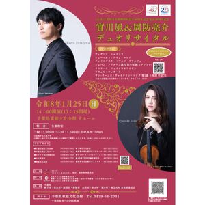 【出演】 實川風(ピアノ) 周防亮介(ヴァイオリン) 【プログラム】 ヴィターリ:シャコンヌ シューベルト:アヴェ・マリア チャイコフスキー:ワルツ・スケルツォ ショパン:ノクターン遺作 嬰ハ短調(ピアノソロ) サラサーテ:ツィゴイネルワイゼン ラヴェル:ツィガーヌ サン=サーンス:ヴァイオリン・ソナタ 第1番 ニ短調 作品75 ※曲目は変更になる場合がございます。 ※このチケットは抽選ではございません。お申し込み順の販売となり、なくなり次第終了となります。ご注文確定後キャンセルすることが出来ませんのでご注意ください。
