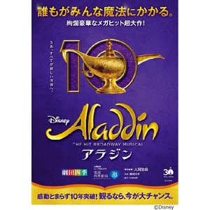 春休み公演 子ども料金あり(S席・A席) ロマンス、冒険、コメディ、そして鳴り止まない喝采。感動のすべてが詰まったミュージカル超大作。 3/27公演購入特典!!☆貸切プレゼント対象公演 ①『アラジン』オリジナルハンドタオル プレゼント!(抽選25名様) ②『アラジン』東京公演プログラム プレゼント!(抽選10名様) ③さらにウィークリーコープをご利用中の方にはチケット購入1枚につき100ポイントプレゼント! ※ライフなび誌面ではご案内しておりませんが、追加決定しました!